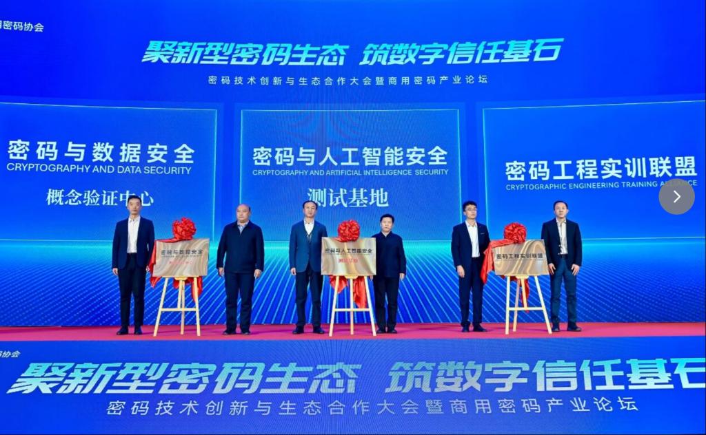 为进一步推动我国新型密码产业发展,大会还发布了云图密码生态行动计划,揭牌成立密码工程实训联盟、密码与AI安全测试基地、密码与数据安全概念验证中心,正式启动网络安全与人工智能创新创业平台,着力推动政府、高校、企业之间加强联合,构建“科学研究-人才培育-成果转化”三位一体融合创新体系,共同推动产业链上下游协同发展,打造覆盖密码技术、人才培养、专用芯片、安全产品、解决方案、测评认证为一体的高水平产业创新生态。
